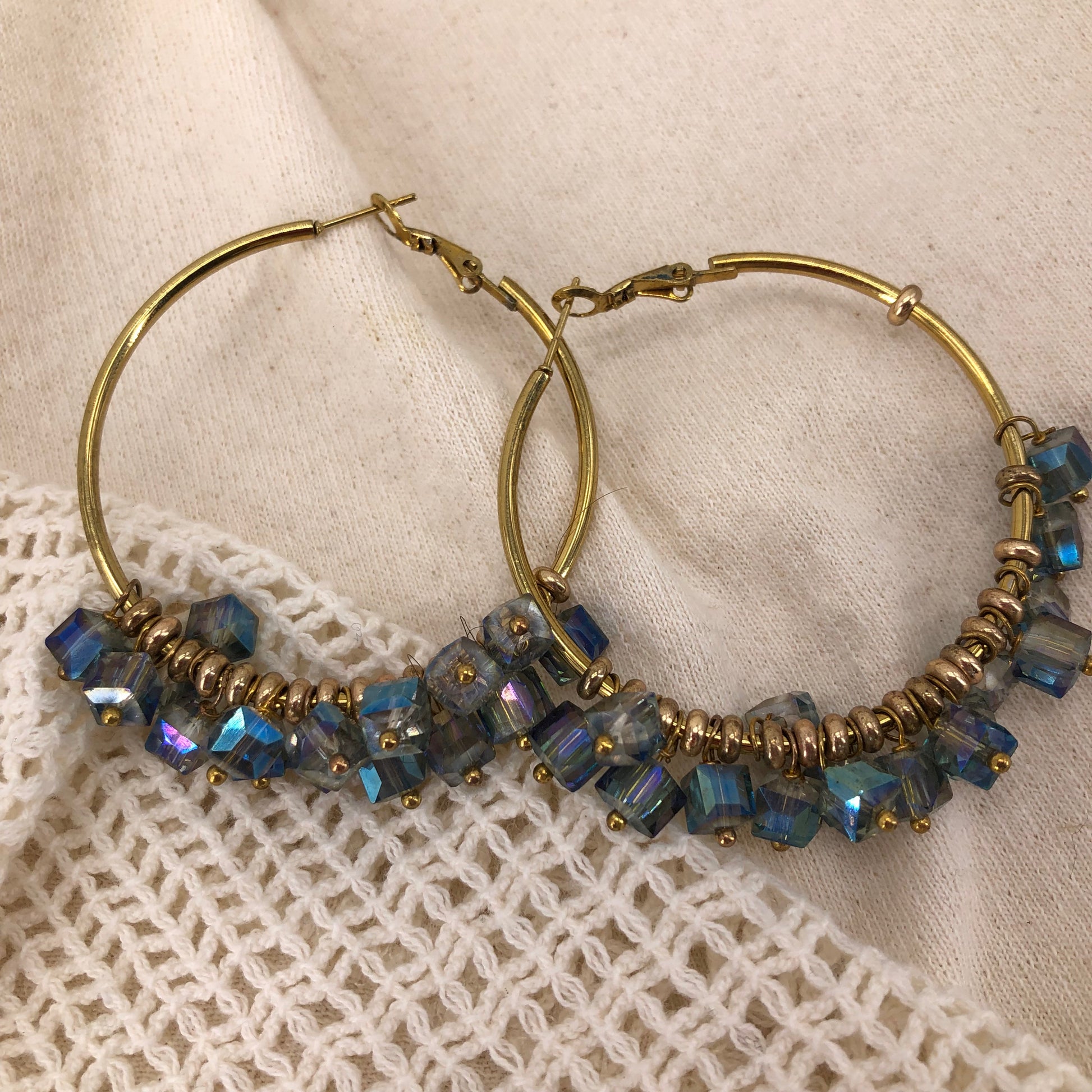 LARGE GOLD HOOPS W/ BLUE BEADS
