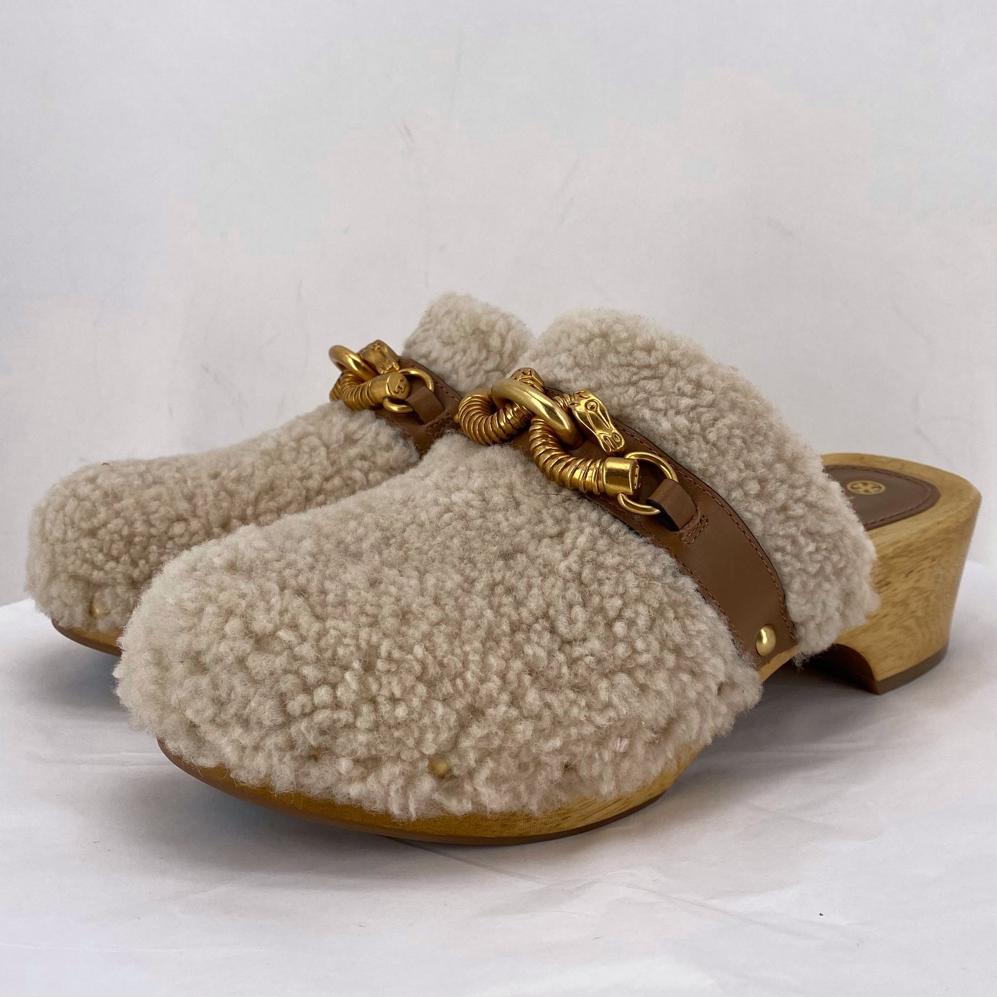 SLIP ON, WOOL ON TOP W/ GOLD HARDWARE, WOOD PLATFORM W/ 2" HEEL